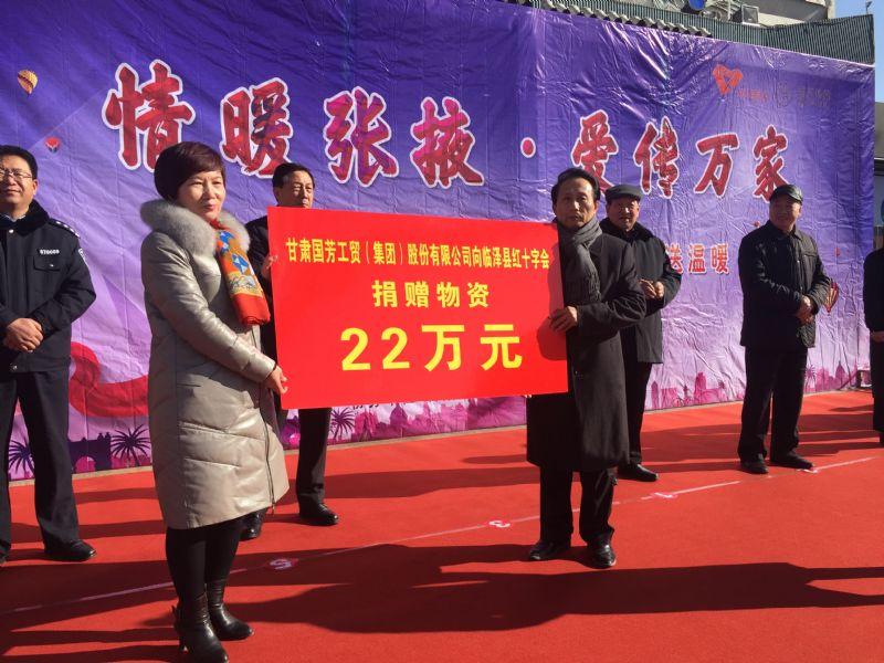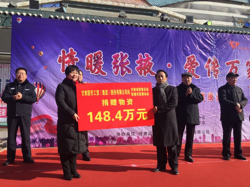 2019年1月11日,甘肅省慈善總會(huì)、張掖市慈善協(xié)會(huì)、甘州區(qū)慈善協(xié)會(huì)以及臨澤縣紅十字會(huì)攜甘肅國芳工貿(mào)(集團(tuán))股份有限公司在張掖市中心廣場(chǎng)共同舉行“情暖張掖·愛傳萬家”送健康送溫暖活動(dòng),將2000套棉衣,2000余套秋衣秋褲,27臺(tái)彩電以及300余件小家電合計(jì)價(jià)值148萬元的過冬物資帶給山丹縣,民樂縣的困難群眾,將2500個(gè)醫(yī)藥箱帶給臨澤縣的老人們。此次活動(dòng)傳導(dǎo)社會(huì)幫扶、精準(zhǔn)扶貧精神的同時(shí)也默默為社會(huì)傳導(dǎo)著一份正能量。