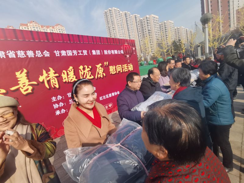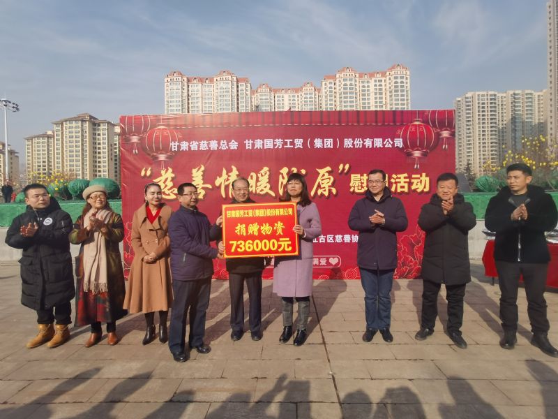 2020年1月14日,甘肅省慈善總會、蘭州市慈善會以及紅古區(qū)民政局攜甘肅國芳工貿(集團)股份有限公司在蘭州市紅古區(qū)海石廣場共同舉行“慈善情暖隴原”暨物資捐贈活動,將2000件棉衣,1200余件秋褲,2000余件保溫杯以及1000余件棉拖合計價值73.6萬元的過冬物資帶給蘭州市紅古區(qū)的困難群眾。