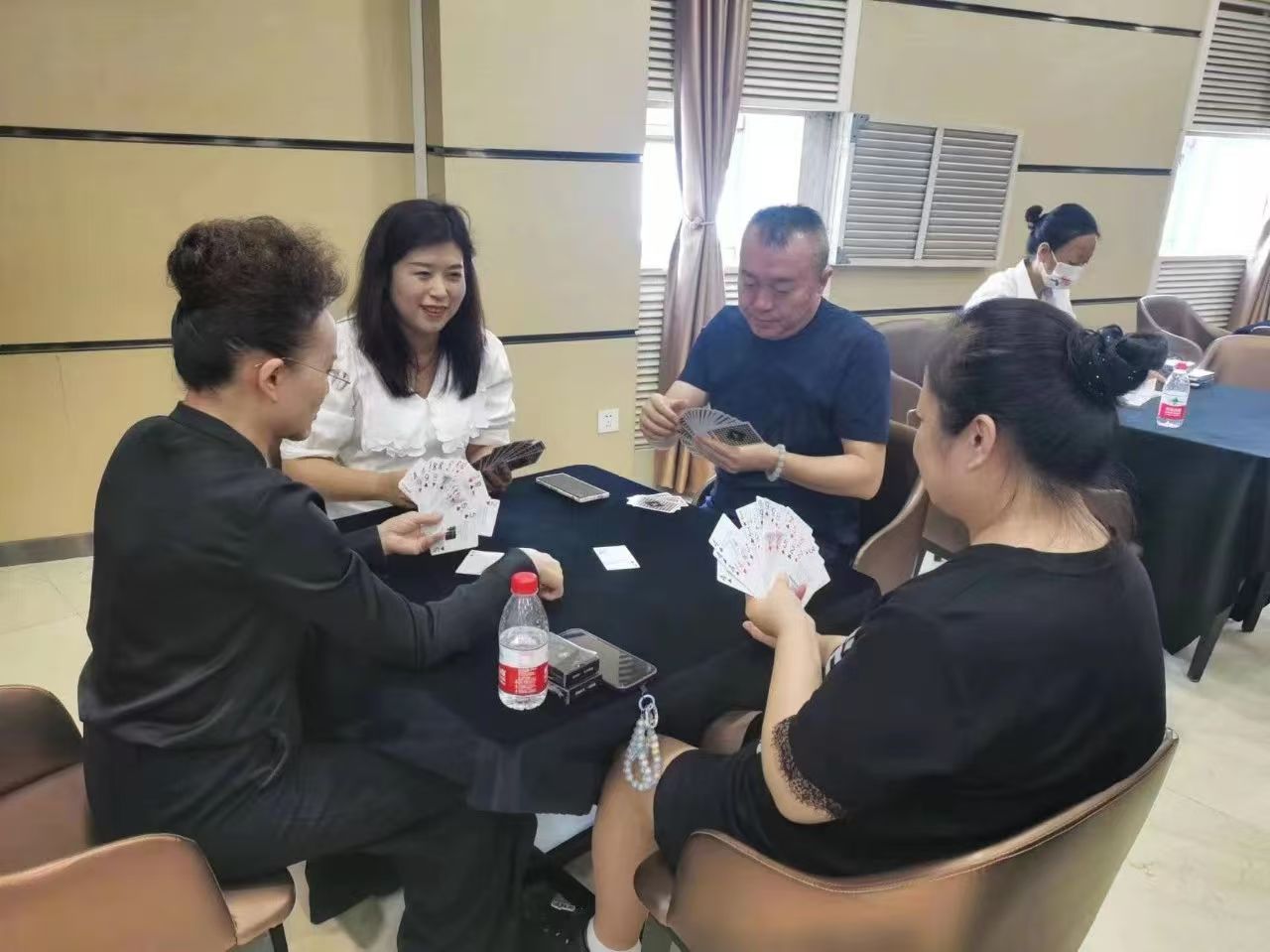 在運動會的摜蛋比賽現(xiàn)場,氣氛熱烈而又緊張。一張張牌桌整齊排列,參賽選手們兩兩相對而坐,神情專注而投入。他們的目光緊緊鎖住手中的牌,大腦飛速運轉(zhuǎn),思考著出牌策略。每一次出牌都顯得深思熟慮,又充滿了果斷和自信。